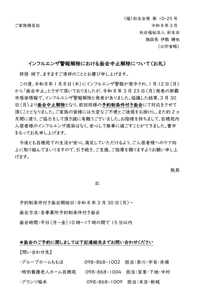 インフルエンザ警報解除における面会中止解除について(お礼)